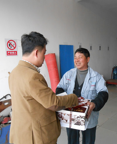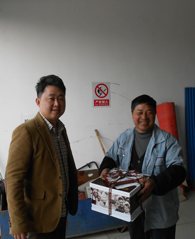 2014年3月18日下午,總經(jīng)理?xiàng)盍链砉緦⑸盏案夂蜏剀白8K偷搅水?dāng)天過生日的員工衛(wèi)金泉和張錦山的手上。對于這突如其來的喜悅,他們非常激動(dòng),同時(shí)表達(dá)了對公司的謝意,并表示會(huì)繼續(xù)努力工作,回報(bào)公司的關(guān)愛。張錦山當(dāng)時(shí)甚至有些“懵了”,在了解了公司領(lǐng)導(dǎo)的來意后,說出了最樸實(shí)的4個(gè)字:謝謝老板!