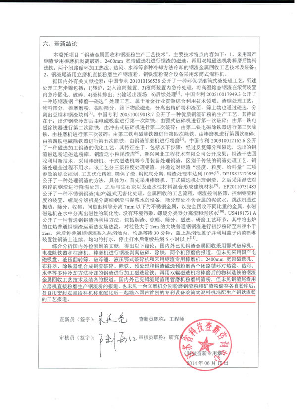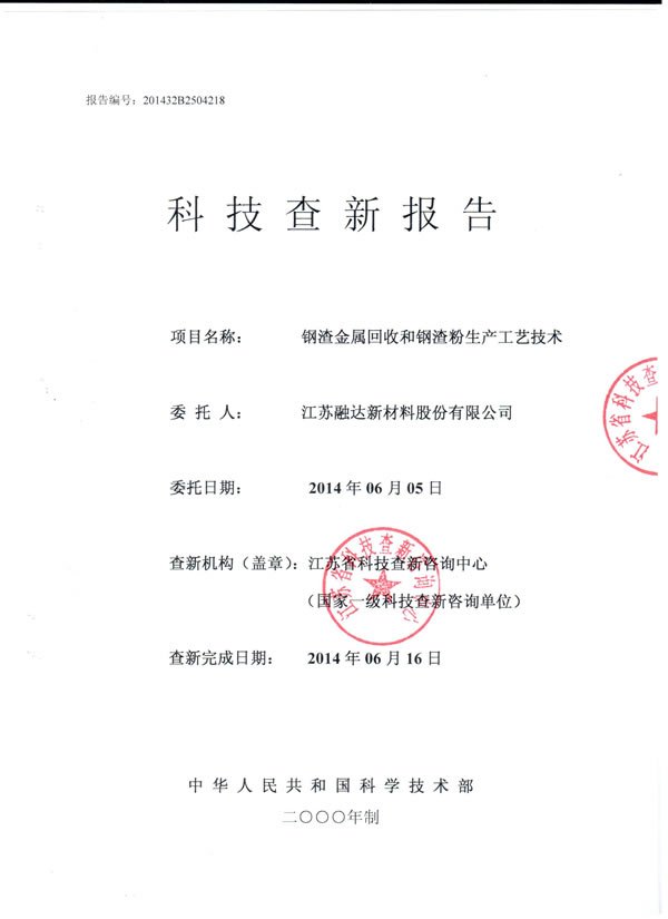 3、鋼渣金屬回收和鋼渣粉生產(chǎn)工藝技術(shù)通過江蘇省科技查新咨詢中心的國內(nèi)外查新,技術(shù)優(yōu)勢明顯。